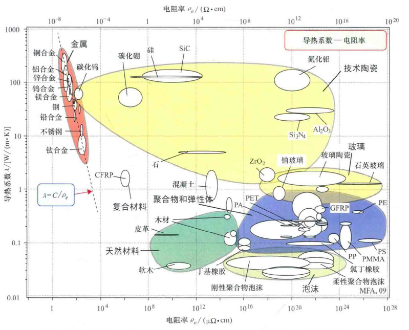 在该图中,横轴为导热系数,纵轴为电阻率。绝大多数金属的数据点集中在左上区域,显示出它们“高导热、低电阻”的共性特征,这对热管理和导电场景的材料筛选很有帮助。