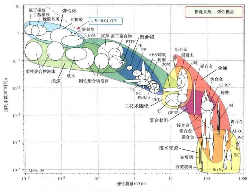 材料的固有阻尼强弱,可用“损耗系数”来衡量。它与弹性模量之间的关系如下图所示,帮助我们在需要减振或共鸣的场景中,更精准地选择材料。