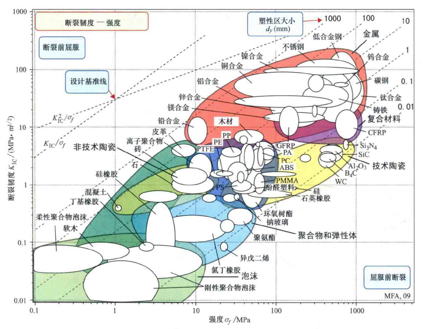 这张图展示了材料的断裂韧度与强度之间的关系。从图中可以看出,断裂过程区的尺寸(图中虚线表示)差异极大——最脆的陶瓷和玻璃仅有原子级大小,而韧性最优的金属甚至可达一米。