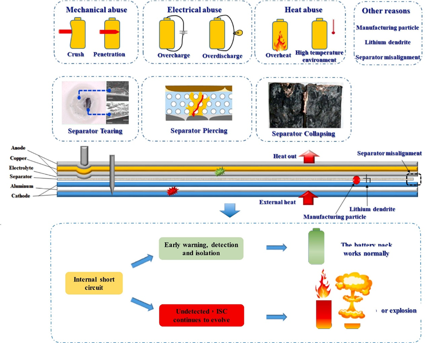 电滥用主要包括四种情形:内短路、外短路、过充和过放。其中,过充与内部短路是引发热失控最常见也最危险的两类。
