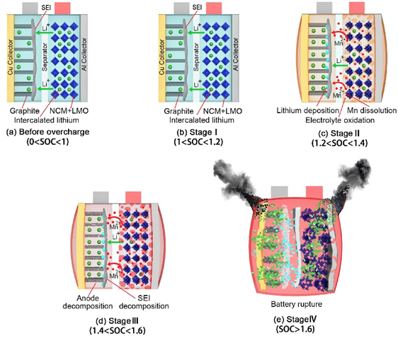 与此同时,负极石墨逐渐达到嵌锂饱和。若继续过充,锂离子无法嵌入,便会在负极表面析出金属锂,形成尖锐的锂枝晶。枝晶极易刺穿隔膜,引发严重内短路。研究表明,在整个过充发热过程中,电解液的氧化反应以及锂枝晶与电解液的反应,是热量产生的主要来源。