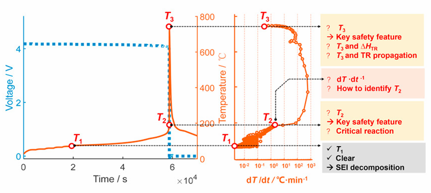 目前有研究针对热失控过程,总结出三个特征温度:自产热起始温度(T1)、热失控触发温度(T2)和热失控最高温度(T3)。
